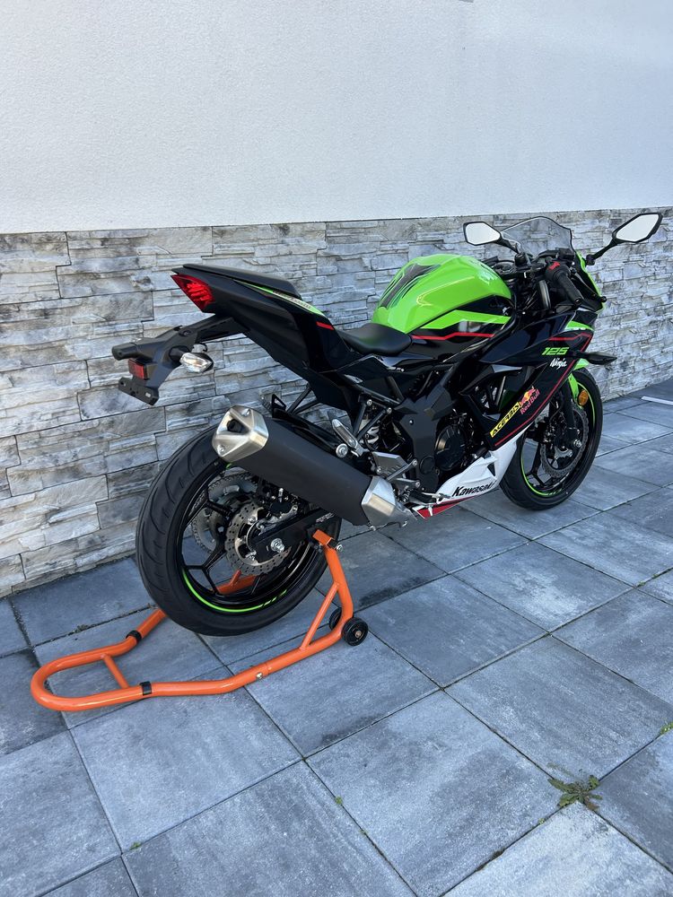 Kawasaki Ninja 125 R/2022 A1 impecabil Km 3.780km Carte service Ulei +filtru de ulei nou 2 chei Acte de Germania,Brief Mare/Brief Mic Certificat COC(Certificat De Conformitate European Trusa de scule Ecran cu afisaj electronic Anvelope fata/spate in stare foarte buna Dunlop Kitul de lant si pinioane in stare buna Motor 4 timpi cu 1 cilindru, 4 valve DOHC, racire pe lichid Capacitate 125 cmc Putere 15 cp Emisii CO2 61 g/km Consum 2.7 l/100 km Pornire electrica Cutie cu 6 viteze Frana fata cu 1 disc 290mm Frana spate cu 1 disc 220mm Suspensii fata furca telescopica 37mm, cursa 110 mm Suspensie spate tip Uni-Trak cu amortizor pe gaz, preajustabil, cursa 120 mm Inaltime sa 785 mm Capacitate rezervor 11 L ABS Instrumentatie digitala de bord Sistem Ergo-Fit. Motocicleta este foarte manevrabila si usor de condus Versiune pentru Germania Posibilitate transport, consultanta in vederea inmatricularii Disponibilitate extinsa de poze si video Nu accept schimburi,m-ai multe detalii la telefon 07 89!