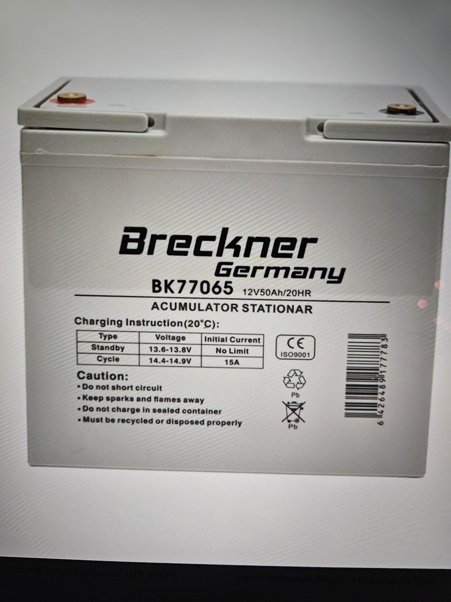 Sistem fotovoltaic Breckner Germany, model SHS1265W, cu baterie inclusa. Caracteristici intrare și ieșire USB, afișaj LCD, protecție la suprasarcină și supratensiune. Panou solar 100W MC4 Breckner Acumulator cu gel BK77065 12V 50Ah Cablu panou solar 4mm x 10 m, 1,5Kv, H1Z2z2-k Breckner plus conectori Toate sunt nefolosite. Detalii despre produse puteti sa le gasiti pe net. Separat panou portabil fotovoltaic tip valiza cu regulator de tensiune 12/24 V 20Ah marca Breckner 400 lei Nou nout in cutie Foarte utile si pentru cei pasionați camping. Se vând si impreuna 1.150 lei