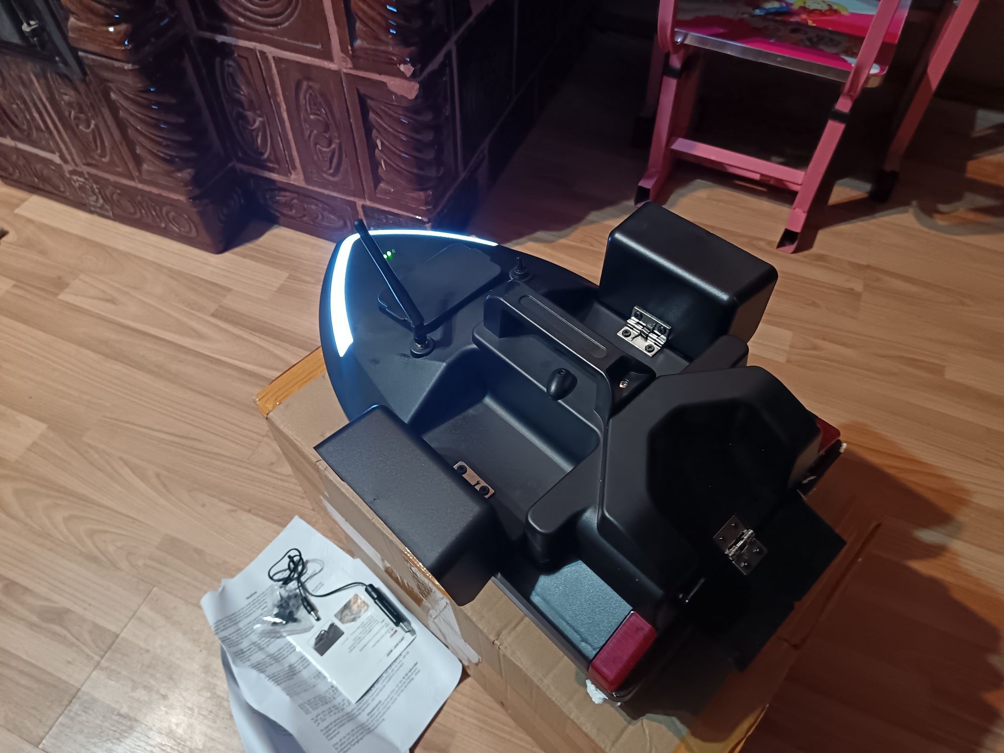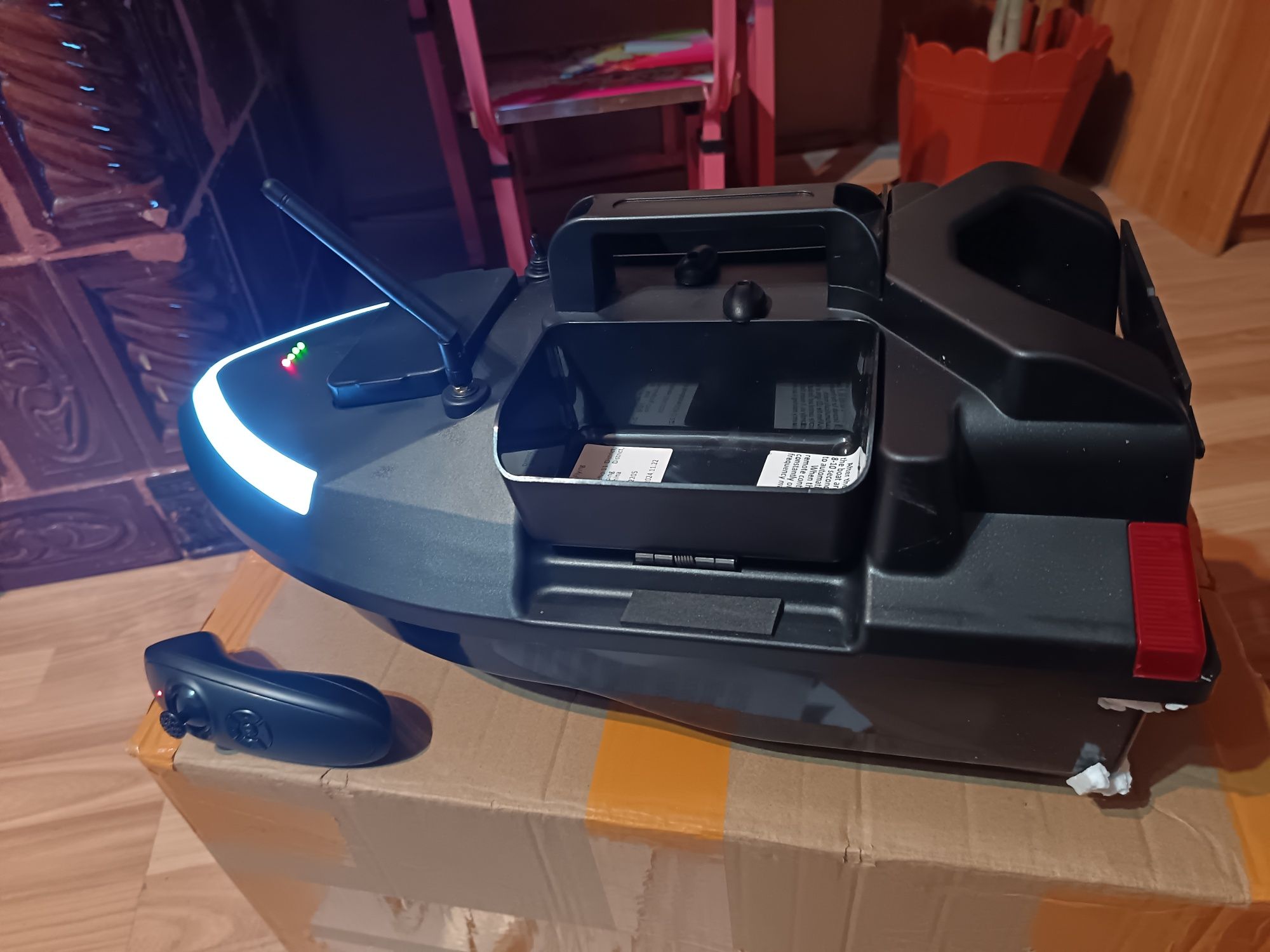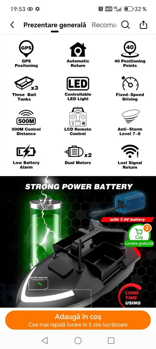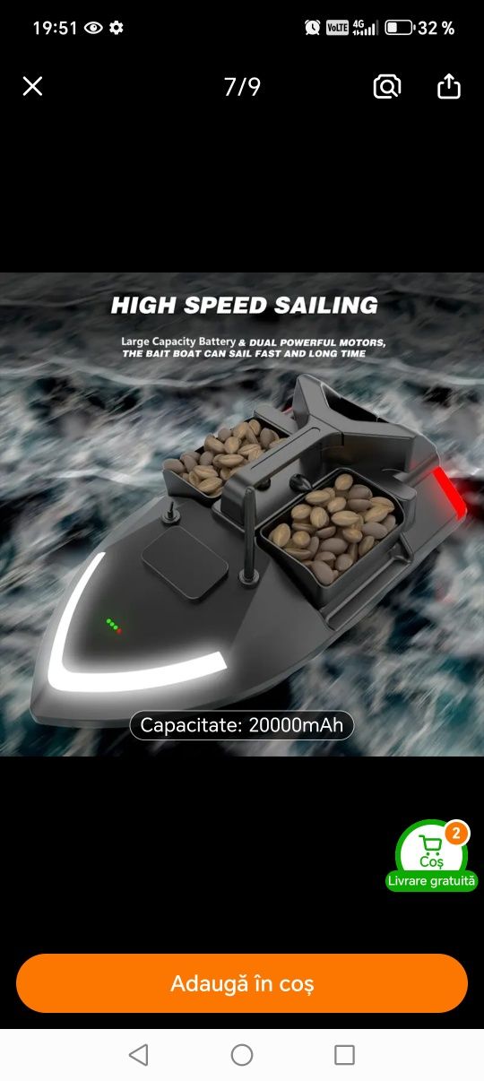 Barca nouă cu două motoare cu trei poziții de nădit, două laterale și una spate Am achiziționato din greșeală neștiind că este destinata mai mult pentru bălți și lacuri mai puțin pe râuri cum a fost intenția mea.