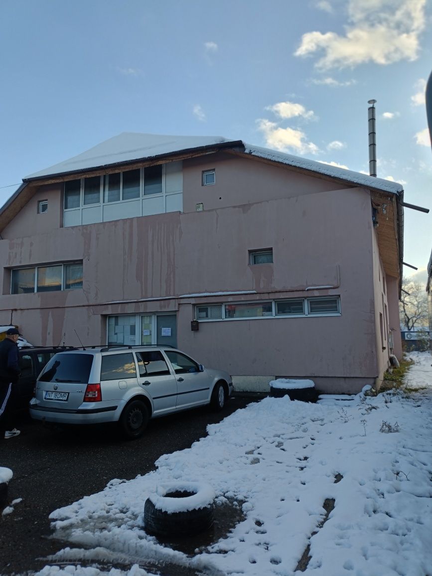 Închiriez hala in Piatra Neamț, str. Negoiului, înălțime 4,8m, 2 uși garaj, geamuri și uși termopan, electric 220/380.Cladirea este renovata, izolata termic, dispune de 1 centrala pe lemne și una pe gaz, calorifere electrice atât în birouri cât și în spațiu producție. Compartimentare spatiu producție, 3 birouri situate la etaj, 2 bai, sala mese și vestiar.