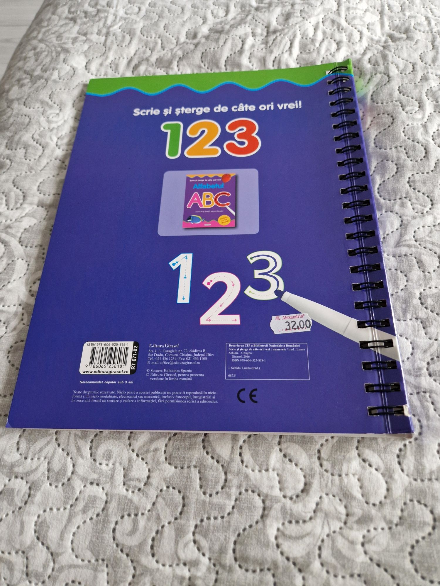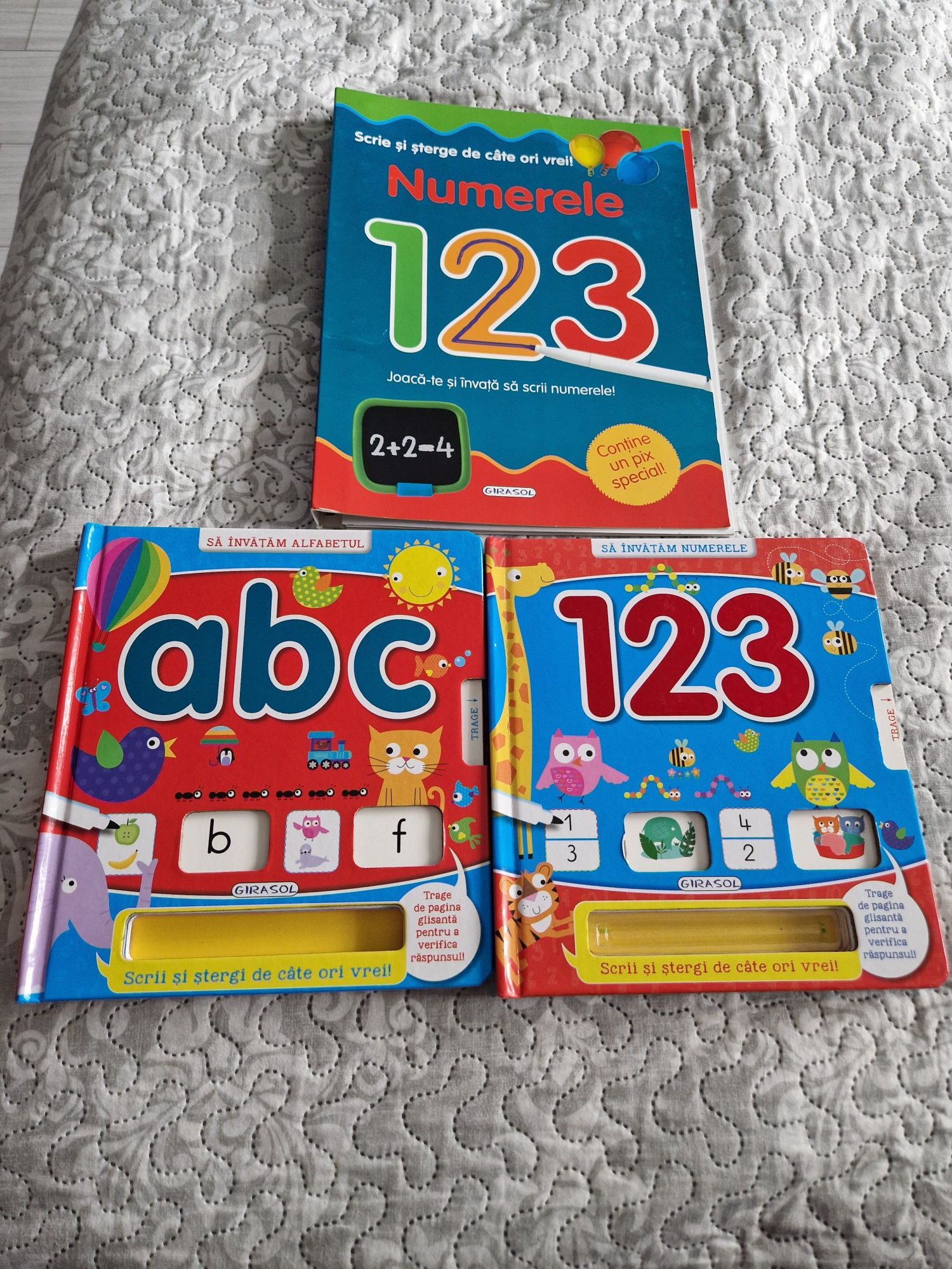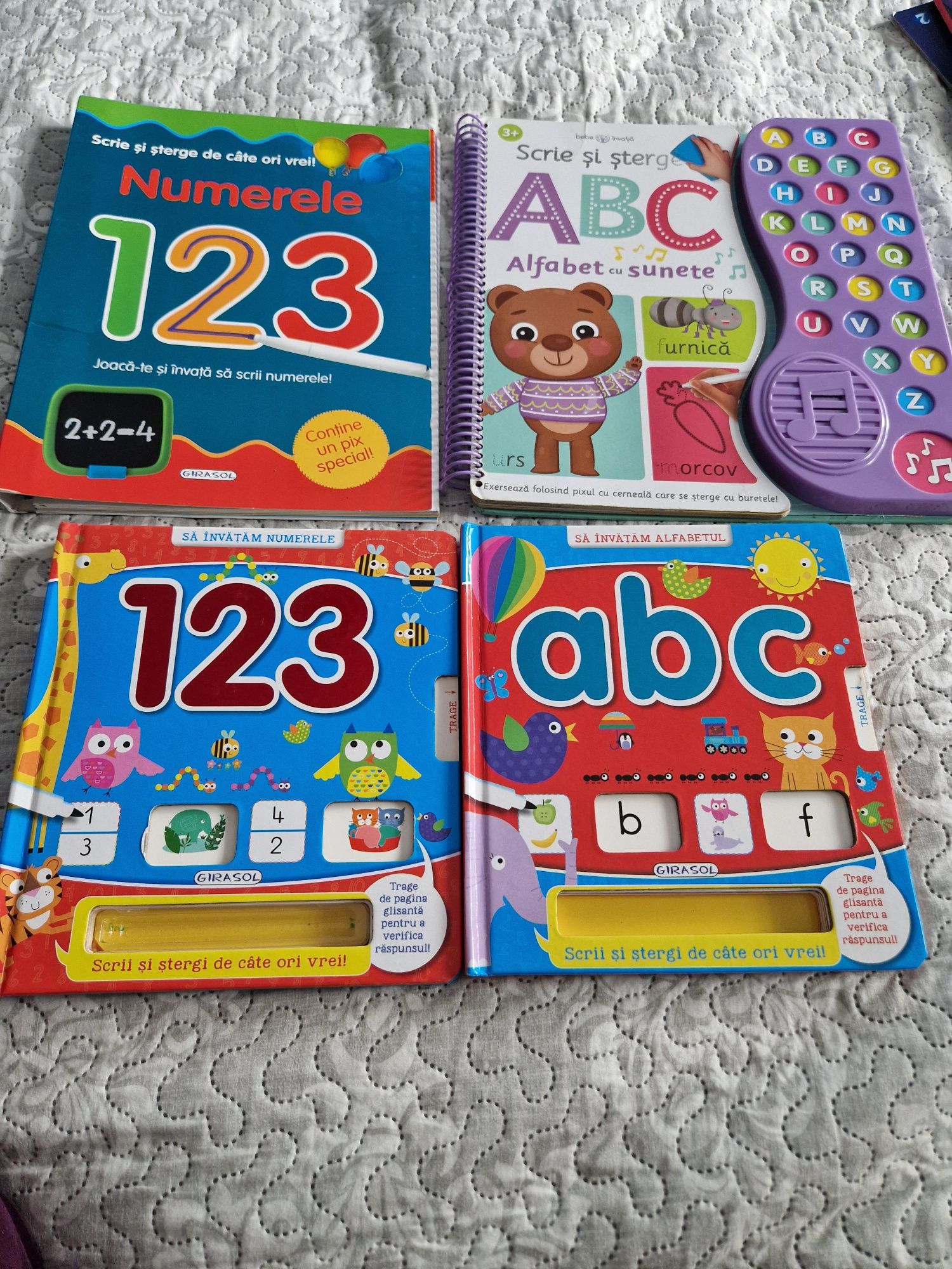 Set de cărți pentru copii scrie/șterge ideale pentru exersat de la 3 ani. La cartea mare cu sunete nu funcționează 5 taste, în rest e în condiții foarte bune. Cele 2 a,b,c si numerele au paginile retractabile pentru a afla răspunsul la activitățile descrise. Iar cartea cea mare 1,2,3 e ca noua . Funcționează cu carioci pt tablă. Se oferă doar o singură carioca.
