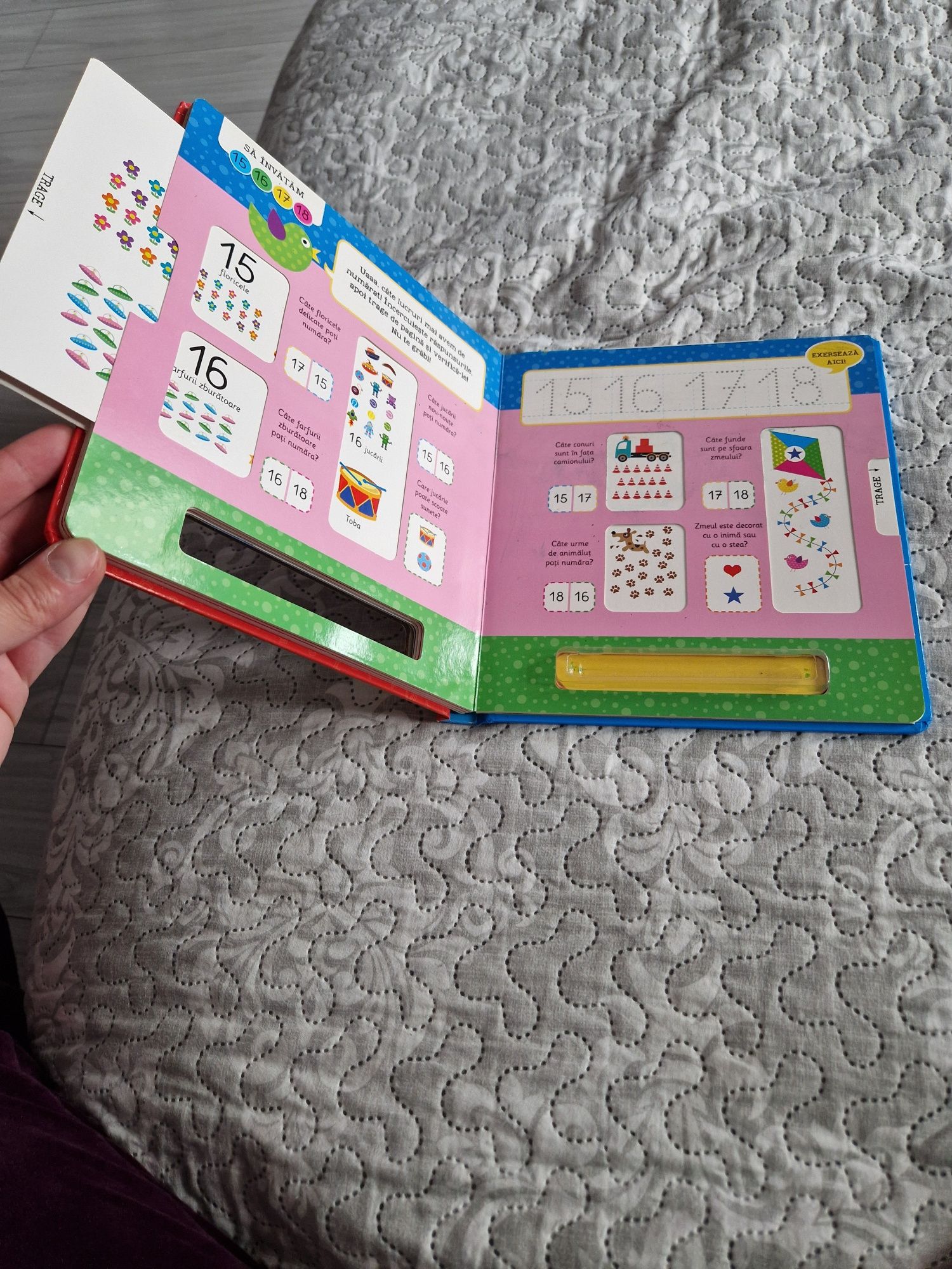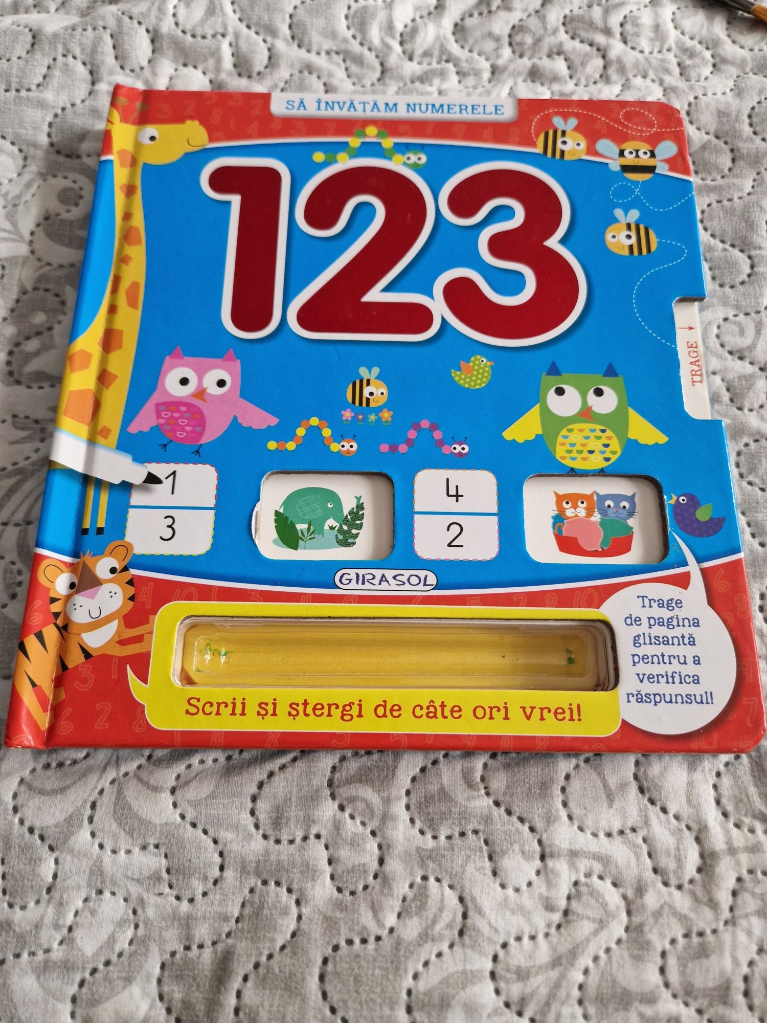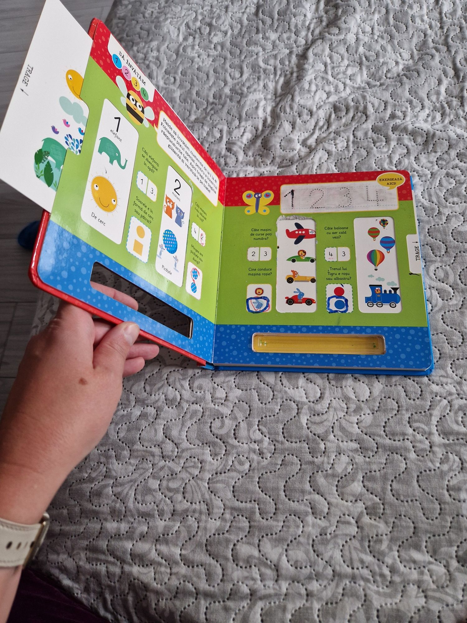 Set de cărți pentru copii scrie/șterge ideale pentru exersat de la 3 ani. La cartea mare cu sunete nu funcționează 5 taste, în rest e în condiții foarte bune. Cele 2 a,b,c si numerele au paginile retractabile pentru a afla răspunsul la activitățile descrise. Iar cartea cea mare 1,2,3 e ca noua . Funcționează cu carioci pt tablă. Se oferă doar o singură carioca.
