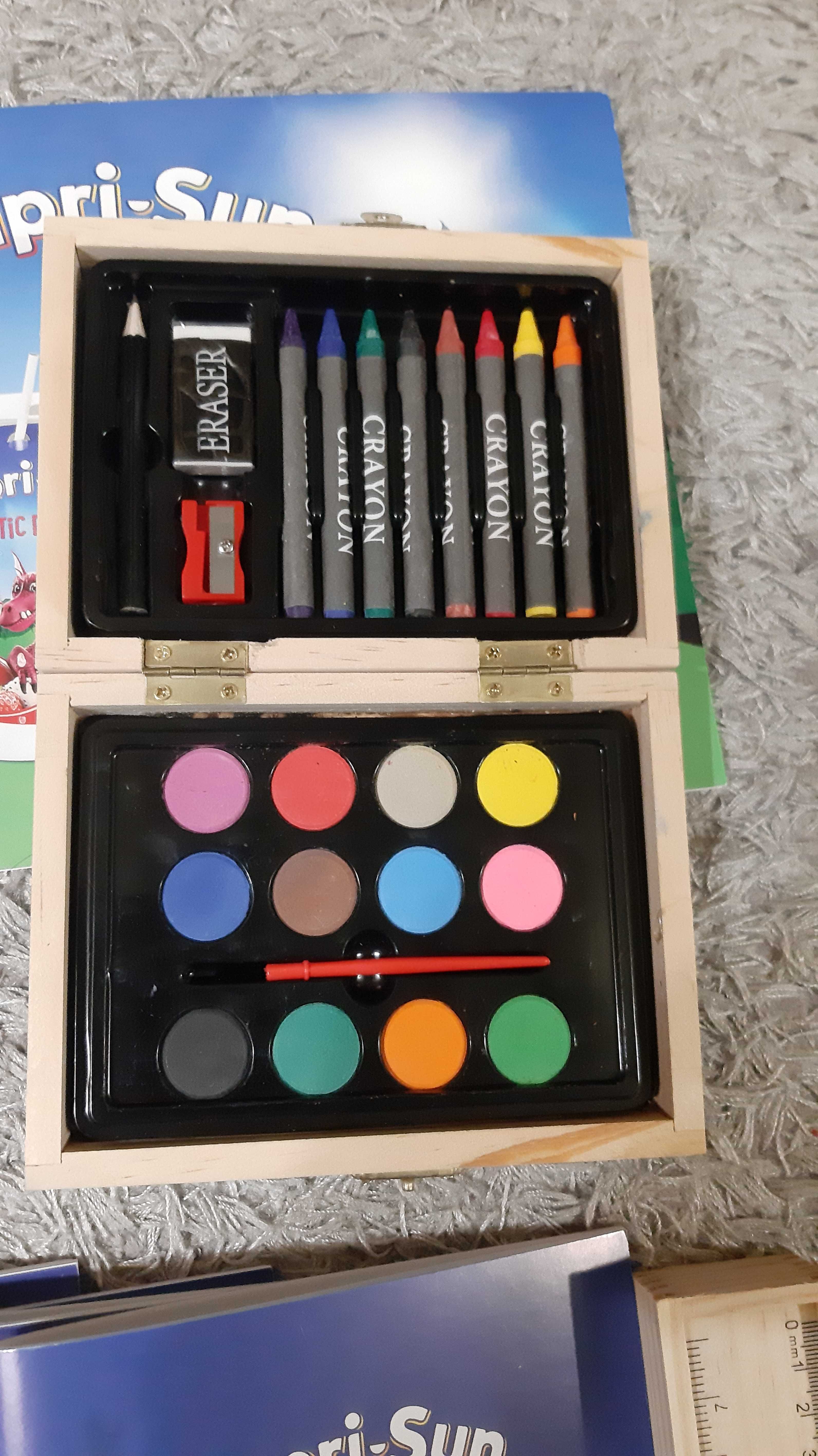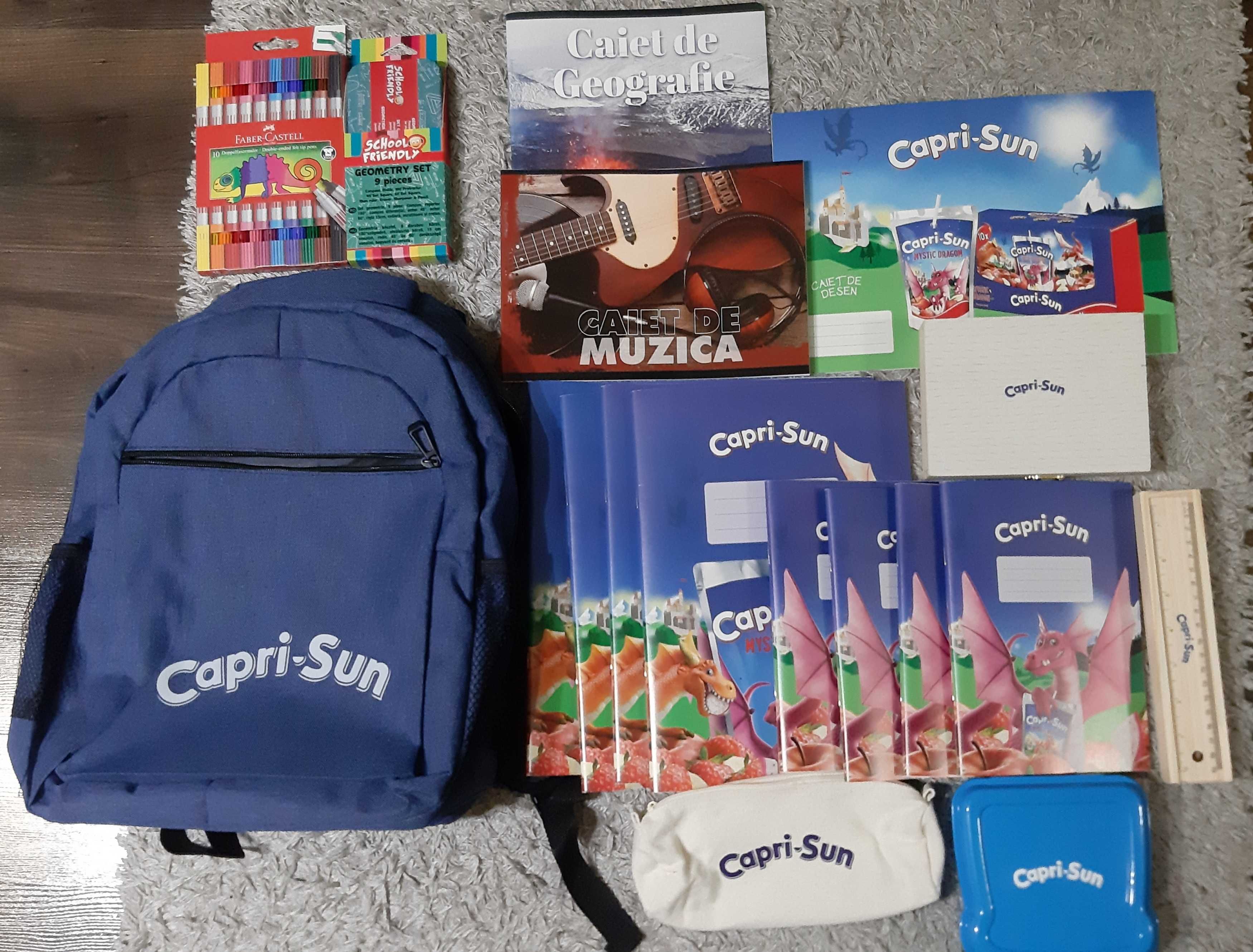 Ghiozdan echipat pentru școala Capri Sun, dimensiune 32cm lungime, 43cm înălțime, 12 cm grosime. Conține 2 caiete dictando A5 48 file, 2 caiete matematică A5 48 file, 2 caiete dictando A4 48 file, 2 caiete matematică A4 48 file - penar, bloc desen, acuarele+pensule, - set creioane colorate, set carioci colorate, - pix cu gel, radiera, trusa geometrie, - caiet muzica, caiet geografie, nefolosit.