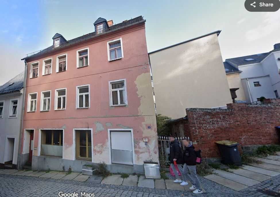 Super oferta Casa P + 2E + Mansarda Situata in CENTRUL orasului Auerbach (Saxonia), str. Burgstrasse nr. 3 Pretabila pentru - Spatiu comercial 70 mp la parter aflat la 25m de piateta din centru orasului - Etajul 1 Apartamnet format din 2 camere, living, bucatarie, baie, TERASA la unul din dormitoare (70mp) - Etajul 2 Apartamnet format din 2 camere, living, bucatarie, baie (70mp) - Mansarda formata din 2 camere mai mici + baie si bucatarie - Magazie de depozitare acoperita (aprox 30 mp) Acoperis in stare foarte buna! Curent (trifazic), apa. In vecinatate magazine (Muller, Netto, banci comerciale, turnul orasului, teren de sport) Oras linistit, aflat la 35 km de Klinghental si granita cu Cehia, 140km de Leipzig, Drezda, 66 km Chemnitz, 44 km Zwickau, 30 km de Plauen Pretabila pentru orice activitate de mic comert / cabinet stomatologic / salon coafura / cafenea / cabinet oftalmologic. Constructie in stare buna, se preda la stadiul actual, necesita amenajari interioare si tamplarie PVC. Va stau la dispozitie pentru mai multe detalii. Pret usor negociabil.