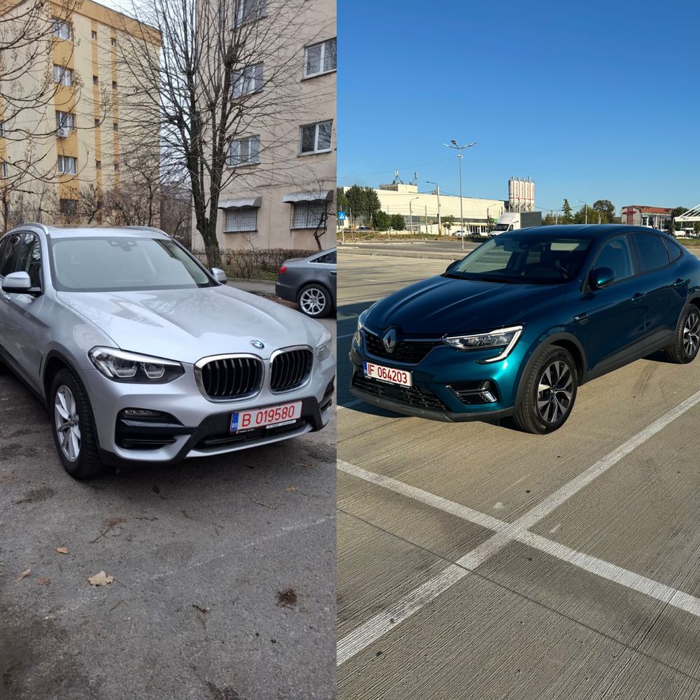 We speak english/Parlons francais. Închiriere auto/rent a car 1. RENAULT ARKANA E Tech 2022, automata - 50 euro/zi pentru 1-3 zile - 45 euro/zi pentru 4-10 zile - 40 euro/zi pentru 11-20 zile - 35 euro/zi pentru perioade peste 21 zile. Masina este întreținută impecabil, are revizia recent efectuata si oferă un consum real surprinzător de bun 5,5% in exterior si 5% in oraș. Autoturismul are CASCO pentru activitatea de rent a car, RCA, rovinieta si este pregătit de iarna. 2. BMW X3, xDrive, diesel, automata, 2021. - 100 euro/zi pentru 1-3 zile - 95 euro/zi pentru 4-10 zile - 85 euro/zi pentru 11-20 zile - 75 euro/zi pentru perioade mai mari de 21 zile. Autoturismul are CASCO pentru activitatea de rent a car, RCA si este pregătit de iarna. Oferim condiții avantajoase si transparenta totala in contract. Se emit facturi fiscale cu TVA pentru toate sumele incasate, inclusiv pentru garantie. Plata cu CARD, VIRAMENT SAU NUMERAR. Conditii inchiriere - vârsta minima 21 ani - permis de conducere cu vechime de minim 2 ani. Disponibilitate de predare/primire la aeroport si nu numai (inclusiv in alte orașe).