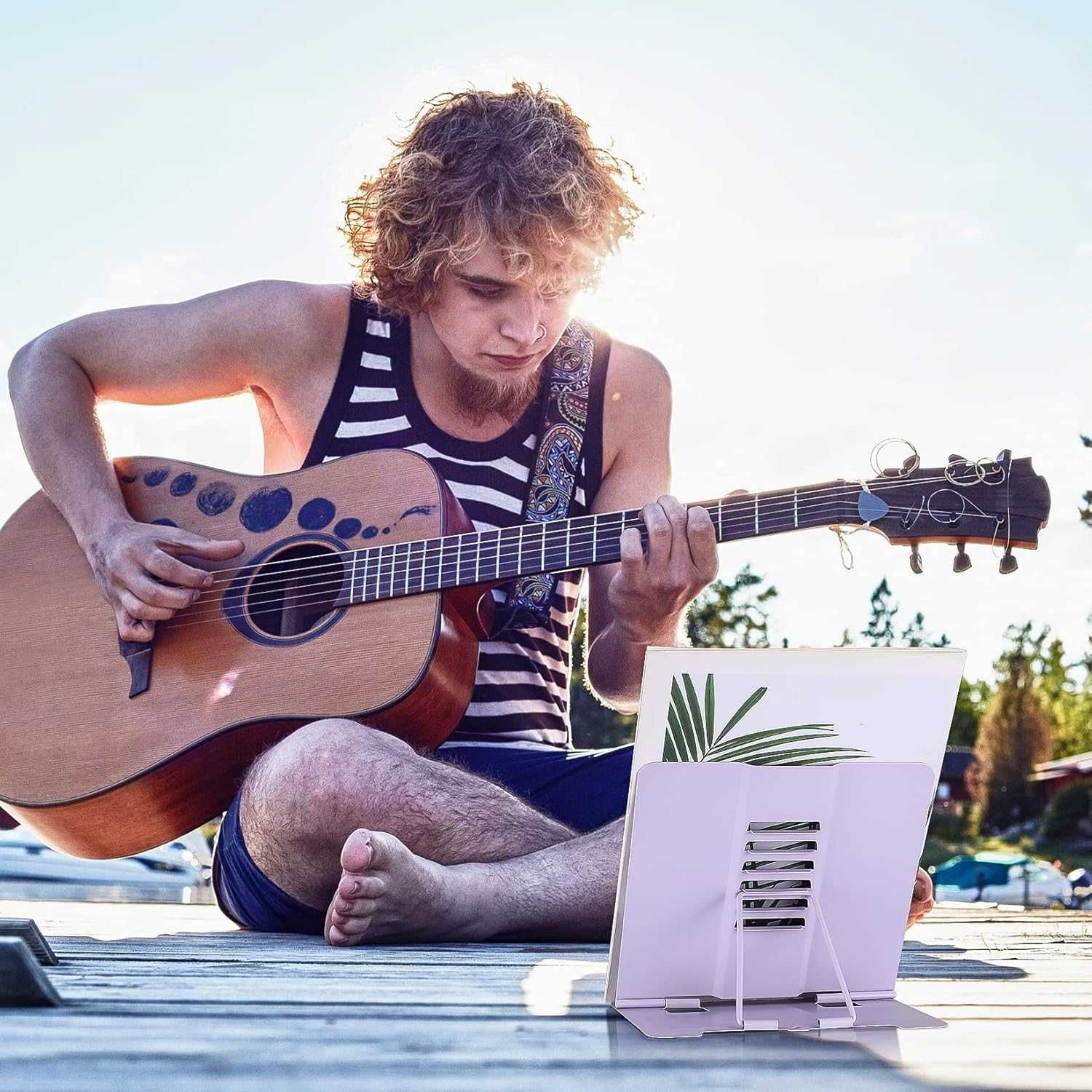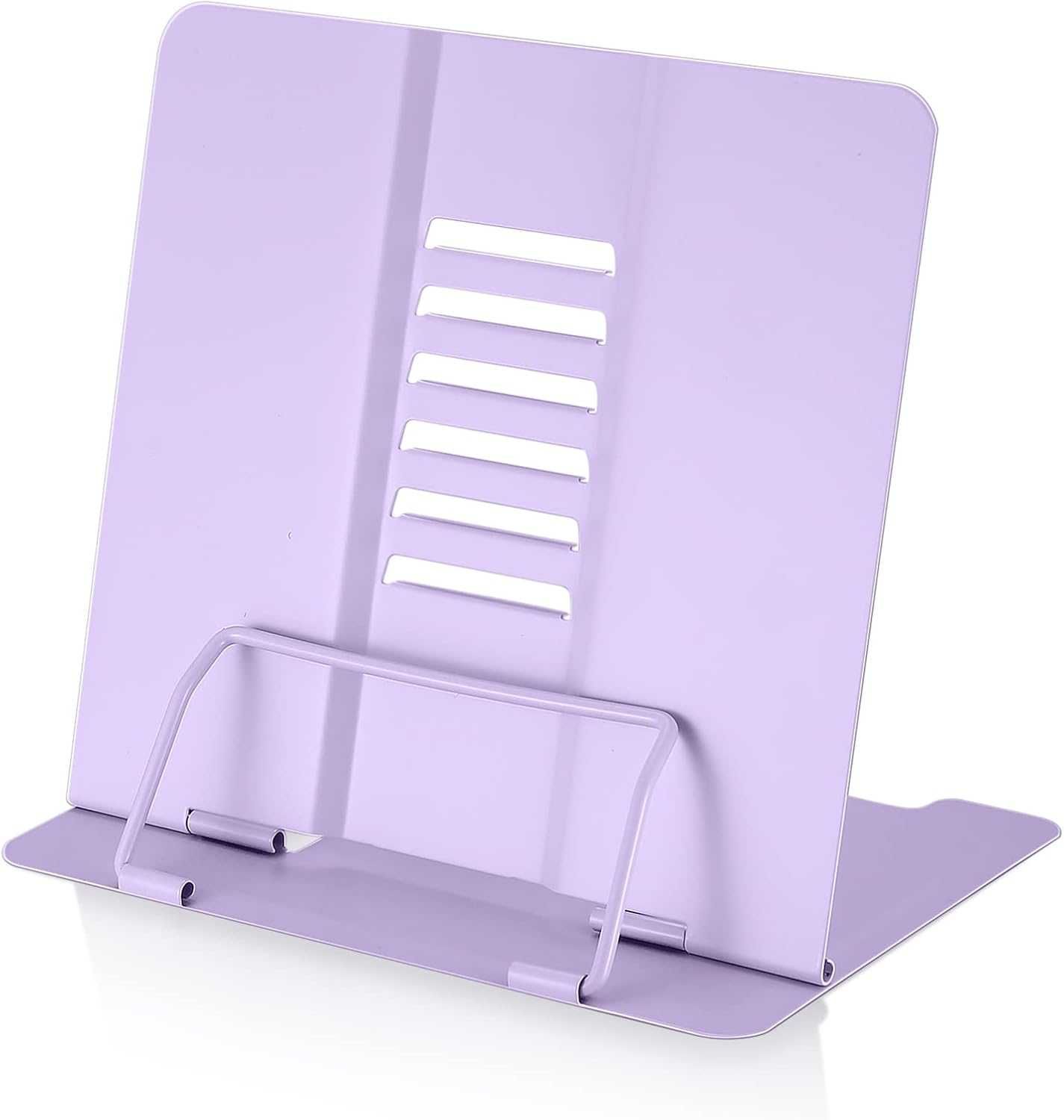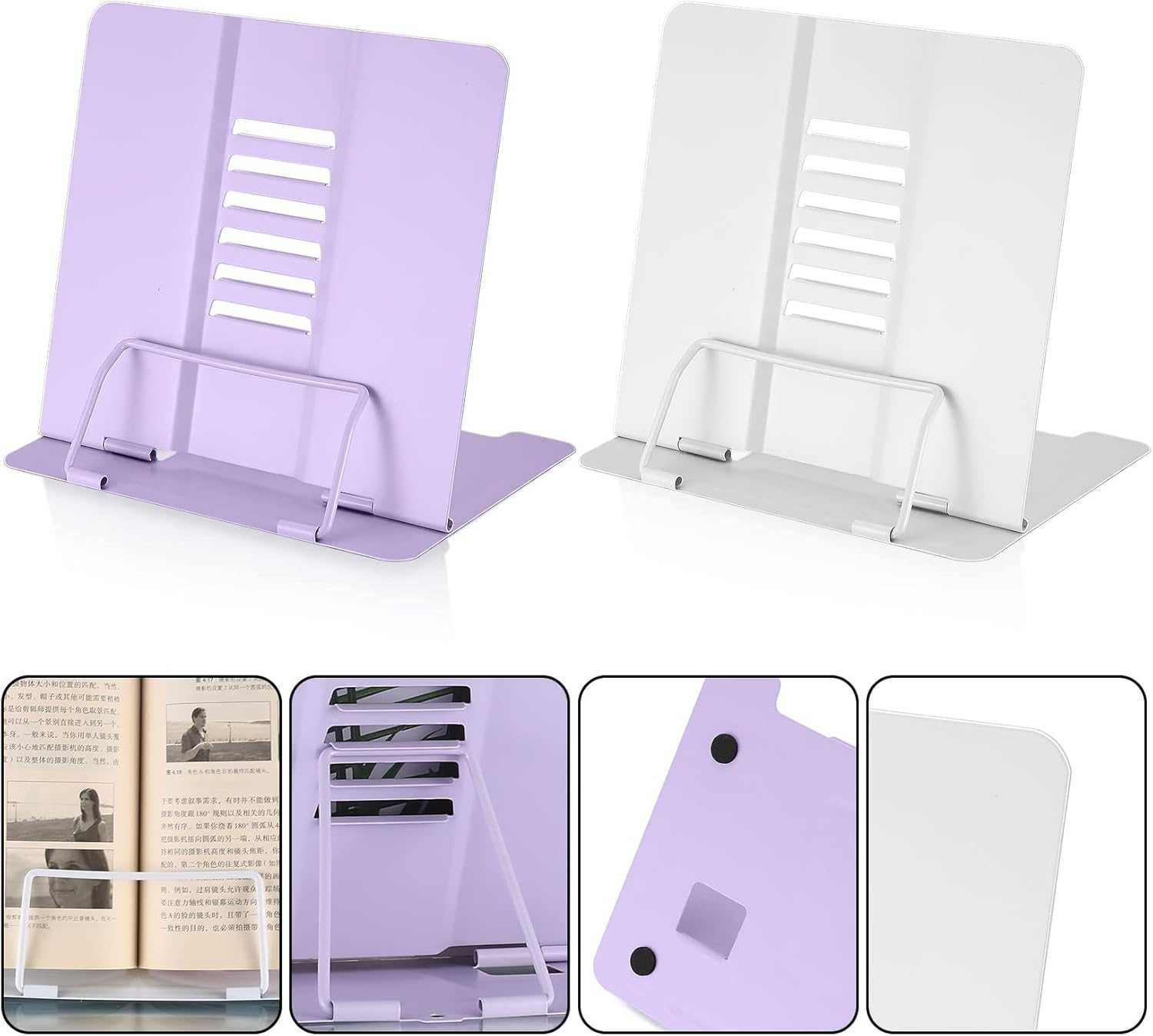 Acest suport de carte pentru lectură este fabricat din metal de înaltă calitate, puternic, neted, nu se sparge ușor, stabil, fiabil și nu se estompează. Marginile netede vă protejează mâinile de răni sau zgârieturi și sunt durabile. Acest suport pentru cărți de bucate are un design reglabil cu 6 unghiuri, înălțimea și unghiul pot fi ajustate în funcție de nevoile dvs., ceea ce ajută la corectarea eficientă a posturii proaste de citire, reducerea oboselii umerilor și gâtului și îmbunătățirea și protejarea sănătății coloanei vertebrale și a vederii. Suportul pentru carte de bucate poate fi folosit direct fără instalare. Designul inferior anti-alunecare îl menține stabil atunci când intră în contact cu masa, protejând în același timp blatul. Disponibil în mov și alb, se potrivește oricărui stil. Potrivit pentru fixarea cărților groase sau subțiri, cum ar fi manuale, romane, cărți de bucate, documente etc., potrivite pentru birouri, școli, biblioteci, cămine, bucătării, dormitoare și alte locuri, poate fi folosit și ca suport pentru tabletă sau suport pentru telefon mobil etc.