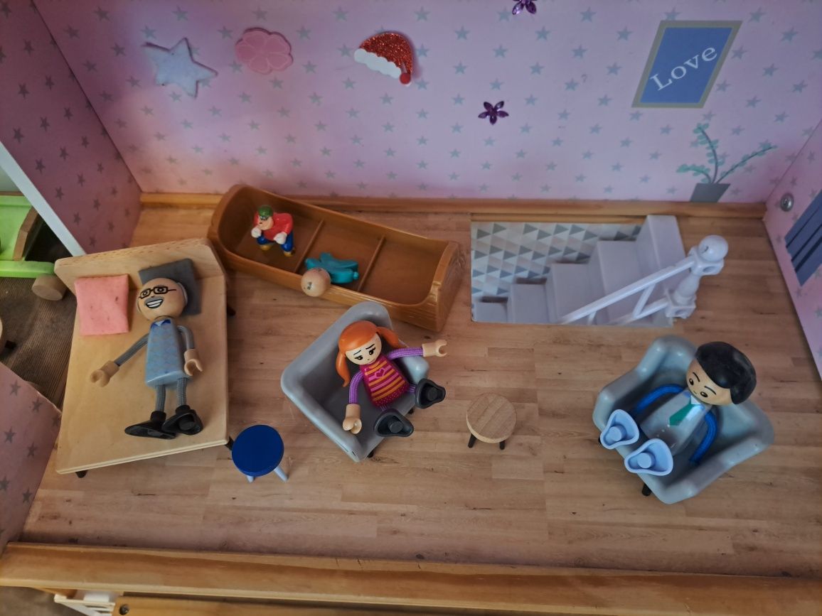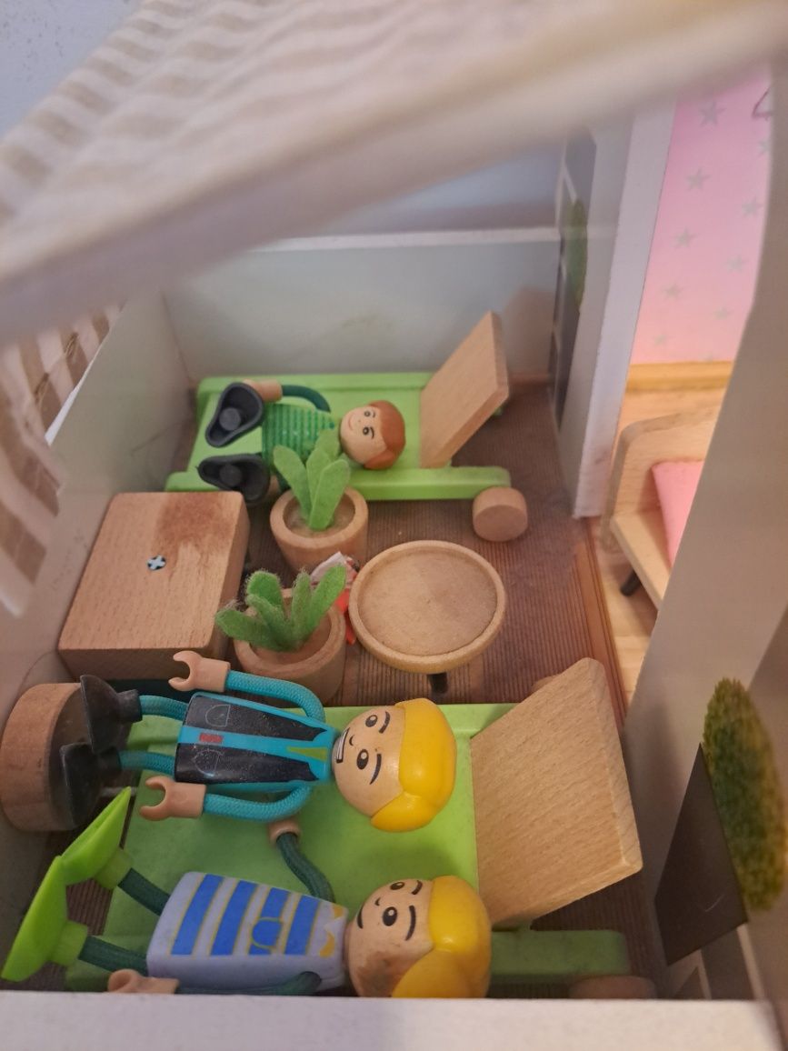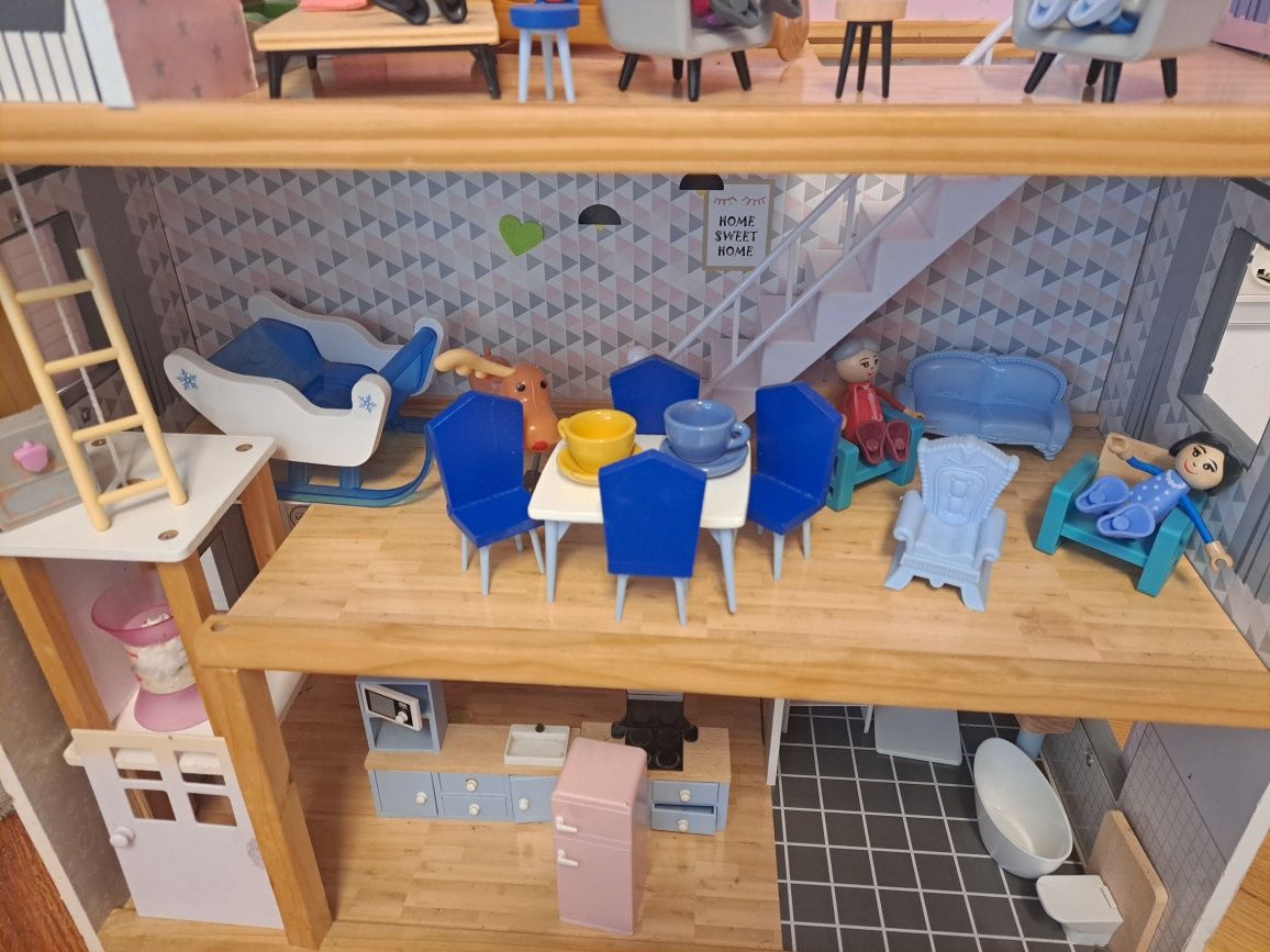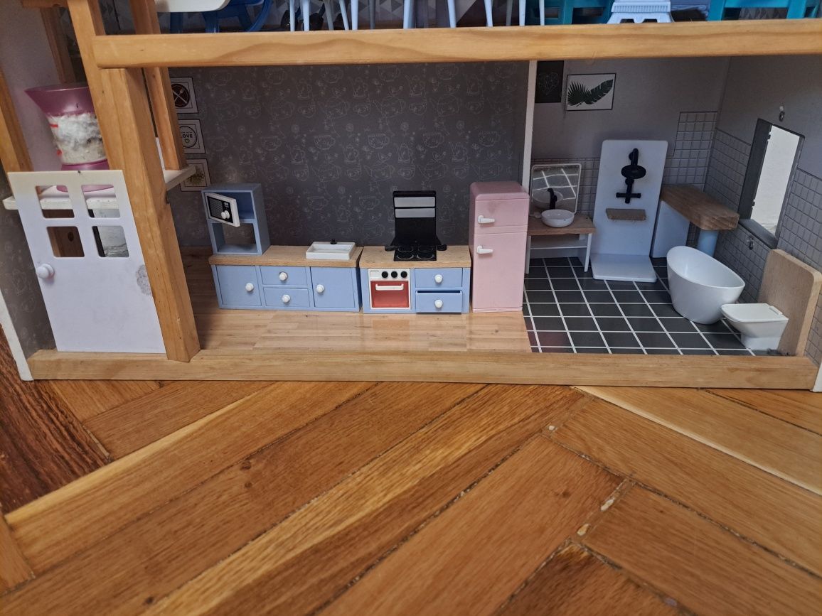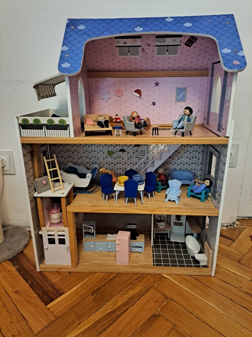 Vand casa de papusi cu toate accesoriile din poze. Este perfecta pentru fetitele care vor o resedinta moderna pentru prietenele lor. Cuprinde 3 niveluri de joc si 4 camere, inclusiv o veranda si lift ce se actioneaza prin invartire. Are și 2 "lampi" ce se aprind individual din buton și se pot pune unde oriunde, iar ușa are un buton ce imita soneria . Vine însoțită de accesoriile ce se vad în fotografii + omuleții( cadou) Dimensiunile căsuței montate 64 x 80 x 31 cm (lățime x înălțime x adancime) Greutate estimativa 7,5 kg