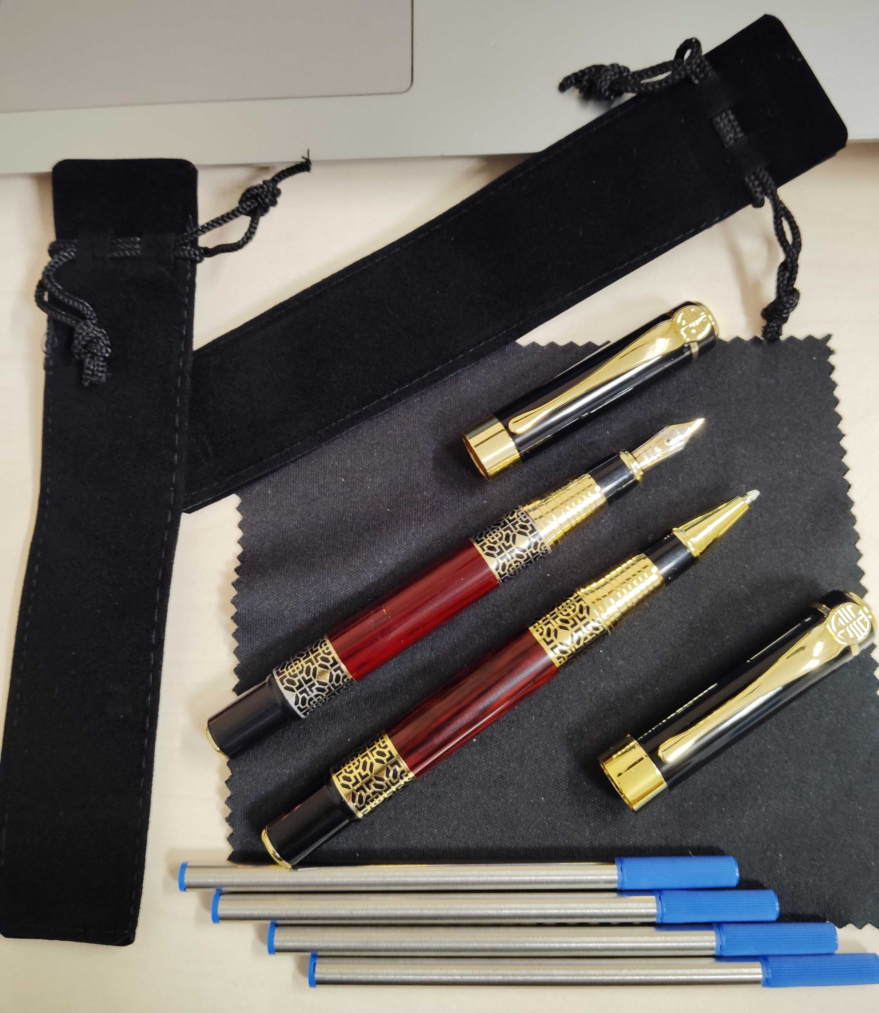 Set Pix de lux metalic combinat cu lemn de trandafir cu 4 rezerve cadou ( pana la epuizarea stocului ) , vine insotit de o husa de catifea ideal pt. cadou . Pixul in sine are o mina de culoare neagra iar cele 4 rezerve au culoarea albastra . pret 40lei fix