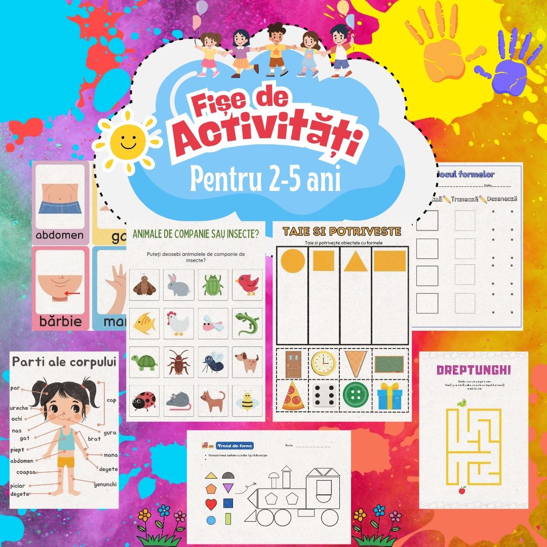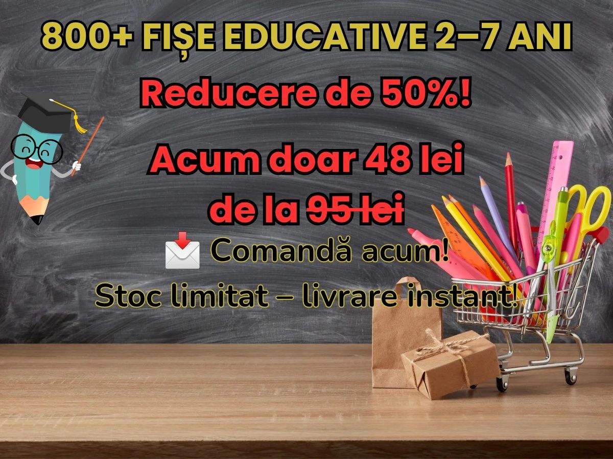 OFERTA LIMITATĂ REDUCERE 50%!! PACHET COMPLET FIȘE EDUCATIV- INTERACTIVE (ROMÂNĂ + ENGLEZĂ) PESTE 800 PAGINI! (format PDF) Dă copilului tău un start excelent în educație prin joacă cu toate cele 4 pachete de fișe, în limba română și engleză! ? Ce primești Pachet A (2-5 ani) 100 pagini cu activități de colorat, decupat, potrivit, trasat și multe altele. Pachet B (3-6 ani) 80 pagini cu exerciții despre litere, cifre, anotimpuri, fructe și alte teme captivante. Pachet C Alfabetul 130 pagini cu activități de recunoaștere, scriere și citire litere. Pachet D Numerele 1-10 111 pagini cu activități de numărare, scris și calcule simple. !! Bonus GRATUIT Toate fișele în varianta în limba engleză peste 400 pagini în plus! PREȚ PROMOȚIONAL 48 RON (în loc de 95 RON!) Trimite-mi un mesaj privat pentru comenzi și detalii. Livrare rapidă pe email, fișe gata de printat!