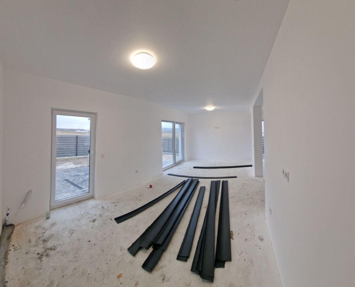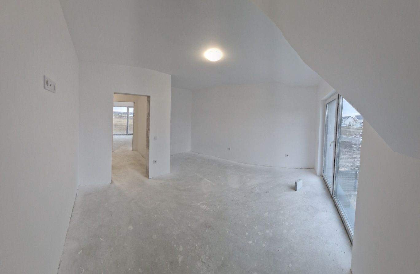 Ultima casă disponibilă!!! Casă Intabulată! Comision 0! Teren teren 391 mp.! Casa independentă energetic! Pompa de căldură și chit fotovoltaic inclus în preț! Casa tip duplex 110 mp utili plus teren curte proprie de 391 mp. situată la 10 minute de centru Sibiului și 5 minute de zona Ind. Vest- cartier Velvet Hills-Șura Mică. Casa este pe 2 niveluri P+M , la parter avem hol și casa scării , baie , spațiu de depozitare, living, bucătărie, dining, la etaj avem hol și casa scării , baie și 3 dormitoare. Casa este construită din cărămidă și beton armat are izolație termică exterioară , acoperiș din țiglă. Foarte important duplexul are zid dublu cu polistiren la mijloc !!! Casa acum este în proporție de 99% finalizată, se predă astfel chit fotovolta ic(contor prosumator), pompă căldură, lavabilă albă pe tavane și pereți, șape autonivelante și încălzire în pardoseală, ferestre termopan si ușa intrare, prize, întrerupătoare etc, la exterior cu izolație termică, pavaje, gard, poartă, apă-canal și curent conectat. Preț casă cu teren 391 mp. 155000 euro Tva 21% inclus în preț. Termen de finalizare Ianuarie 2025 . Rusu Sergiu tel 07 19 sibiu casa teren imobiloare