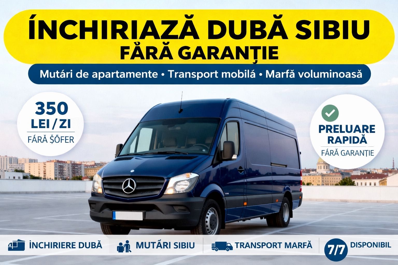 Închiriere Dubă în Sibiu FĂRĂ Garanție Mutări & Transport Marfă Cauți închiriere dubă în Sibiu, rapid și fără complicații? Îți ofer dubă de marfă de închiriat în Sibiu, fără garanție, ideală pentru mutări de apartamente, transport mobilă, marfă voluminoasă sau deplasări în oraș și în afara acestuia. Serviciul este gândit pentru persoane fizice și firme care au nevoie de transport marfă în Sibiu, simplu, sigur și la un preț corect. Dimensiuni utile dubă (spațiu de încărcare) Lungime 420 cm Lățime între roți 130 cm Lățime totală 170 cm Înălțime 200 cm Spațiu generos pentru mobilă, electrocasnice, paleți, materiale de construcții sau marfă voluminoasă. PACHET STANDARD ÎNCHIRIERE DUBĂ FĂRĂ ȘOFER 350 lei / zi 100 km incluși FĂRĂ GARANȚIE Preluare rapidă din Sibiu Ideal pentru mutări personale sau transport marfă PACHET CU ȘOFER TRANSPORT MARFĂ SIBIU 600 lei / zi (max. 6 ore) 150 km incluși Potrivit pentru livrări, curse locale sau extraurbane SERVICII MUTĂRI SIBIU CU AJUTOR LA CĂRAT 750 lei / zi cu 1 persoană 1000 lei / zi cu 2 persoane Mutări apartamente și case Transport mobilă, electrocasnice, echipamente Rapid, organizat și eficient Opțiuni suplimentare Ore suplimentare 100 lei/oră Asistență extra 80 lei/persoană/oră Curse speciale în țară (București, Cluj, Brașov, Timișoara etc.) 400 Ron/zi Locație & Disponibilitate Sibiu preluare flexibilă sau livrare la cerere Disponibil 7/7, inclusiv weekend și sărbători Contact direct 07 05