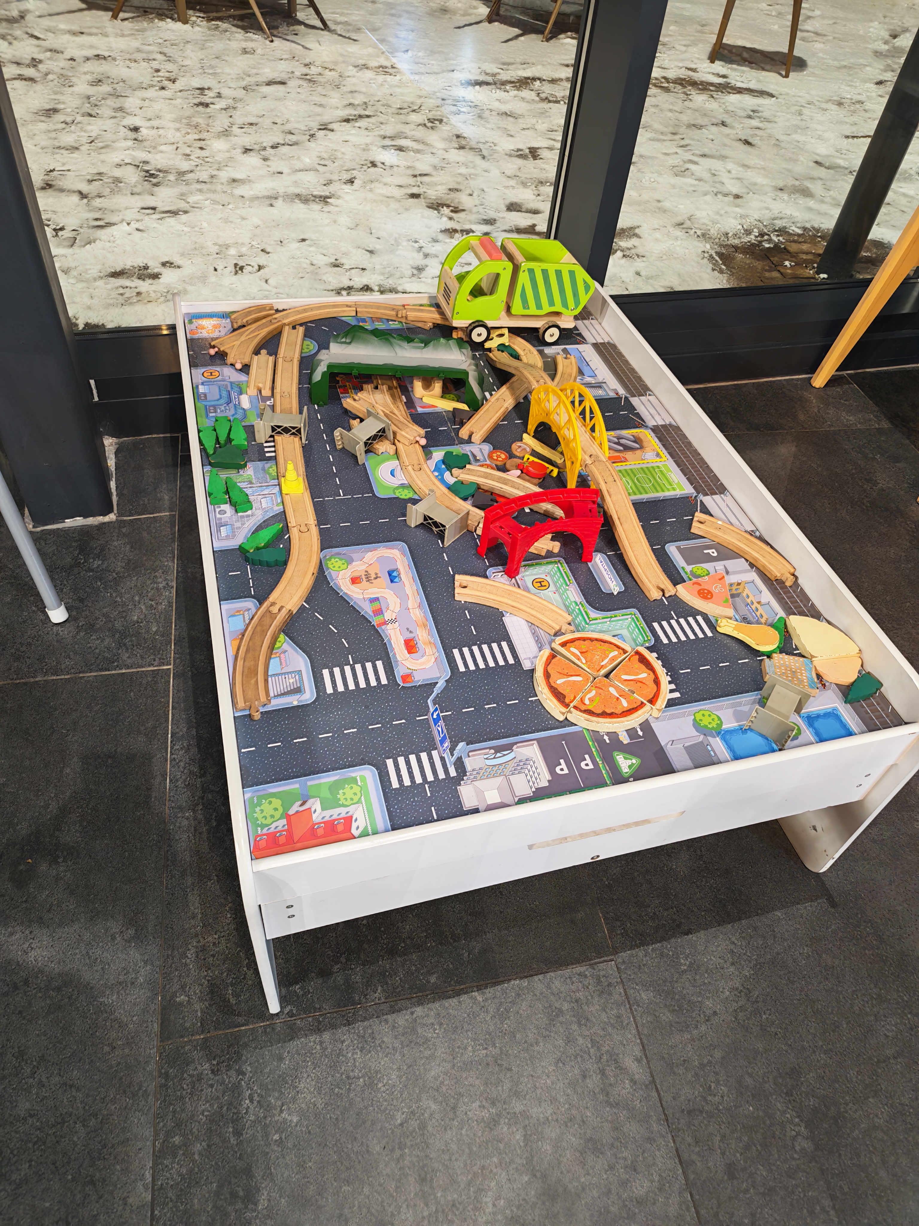 Vine cu jucării incluse. Are spațiu de depozitare sub masă. Dimensiuni: 60 cm pe 120 cm, înălțime 30 cm.