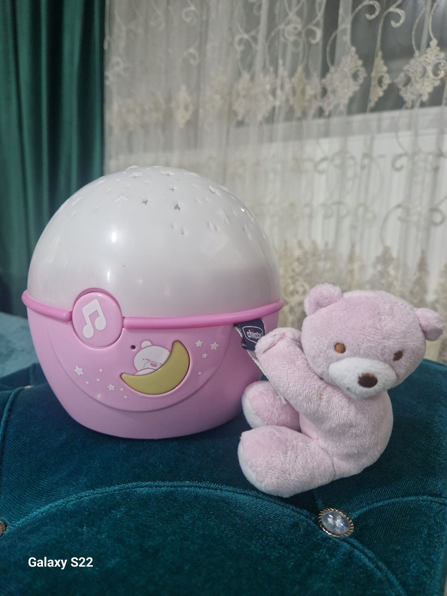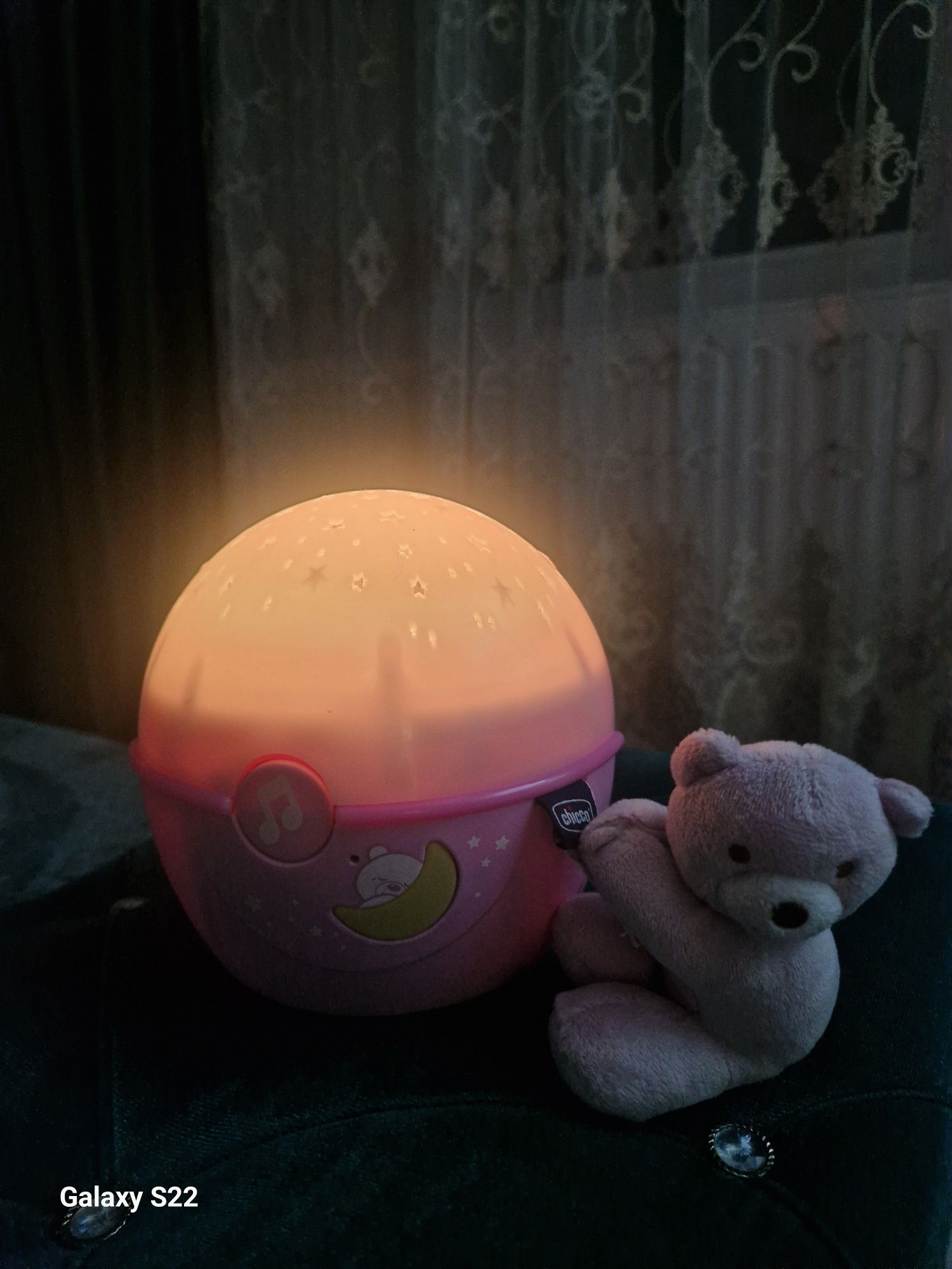 Lampa de veghe Chicco Next 2 Stars, ideală pentru a-i oferi copilului un somn liniștit. Proiectează imagini stelate pe pereți și plafon, emite sunete liniștitoare și are o funcție de oprire automată după 30 de minute. Această lampă este un cadou potrivit pentru bebeluși și copii mici.