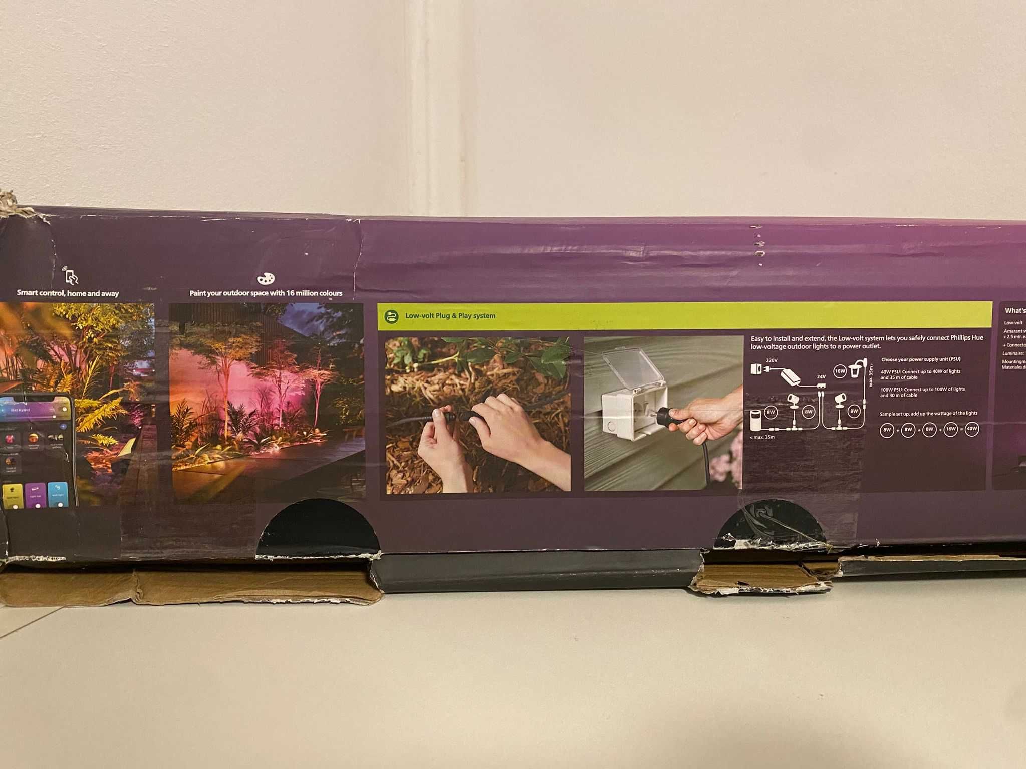 Philips - Lampă LED RGBW reglabilă pentru exterior Hue White and Color Ambiance LED/20W/24V IP65 Corp de iluminat LED exterior din gama Hue Amarant. Este necesar să dețineți Hue Bridge pentru utilizare, ceea ce vă oferă și multe alte funcții. Reglarea temperaturii luminii de la 2000 K până la 6500 K. Setări extinse, selecție din 16 milioane de culori (White And Color Ambiance) - RGB. Posibilitatea de a seta durata iluminării, automat sau manual. Reglați intensitatea, temperatura și culoarea luminii în grădina dumneavoastră. Creați o atmosferă unică - petrecerea dumneavoastră nu va mai fi niciodată la fel. Corp realizat din aluminiu de calitate și sticlă securizată. Este necesar să dețineți Hue Bridge și o sursă de alimentare cu tensiune joasă - poate fi achiziționată aici. Utilizare simplă și sigură datorită sistemului cu tensiune joasă (24 V), lumina poate fi conectată la o priză externă printr-o sursă de alimentare disponibilă separat. Clasa de protecție IP65 - carcasă de înaltă calitate care protejează lumina de grădină împotriva jeturilor de apă. În pachet este inclus 1x corp de iluminat de perete din seria Amarant de culoare neagră, cu sursă de lumină LED integrată și cabluri de conectare. Poate fi conectat cu alte produse din seria Hue, destinat utilizării exterioare. Transformatorul nu este inclus în pachet! Compatibil cu Amazon Alexa pentru control vocal (Echo / Echo Dot și necesarul Hue Bridge se vând separat), Apple HomeKit și Google Assistant. Produs nou. Ambalaj deschis/deteriorat.