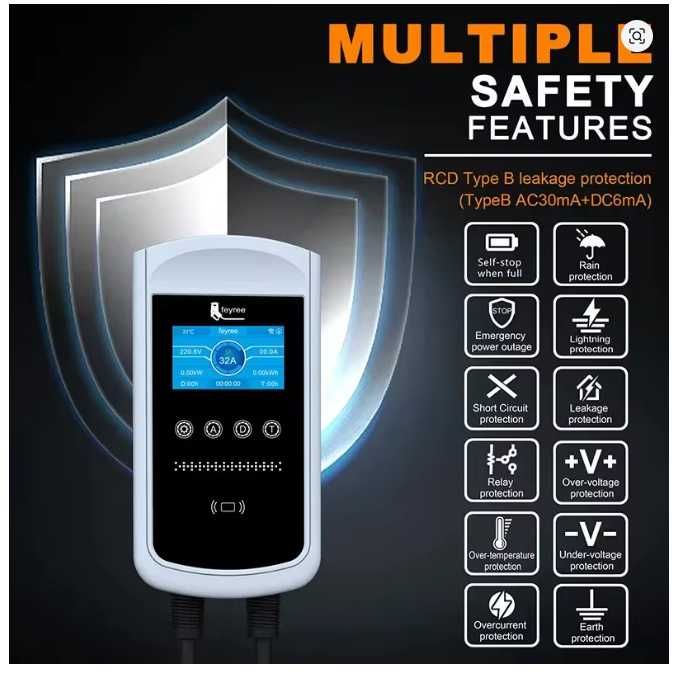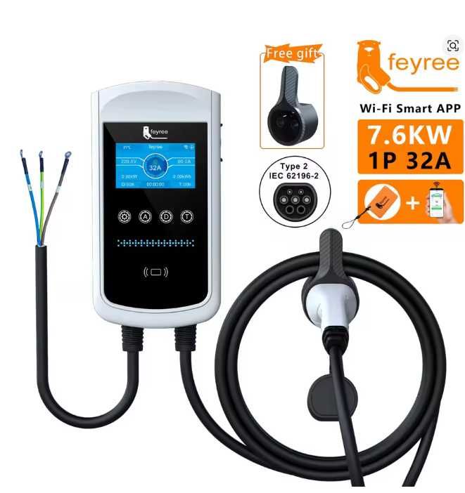 Stație de încărcare monofazată Wi-Fi inteligentă Feyree de 7,6 kW și 32 A. Dispune de o aplicație mobilă pentru control și monitorizare (Tuya sau Smart Home). Vine cu un cablu de încărcare inclus. Main Features Safe and CE & FCC Certified feyree EV charger is CE certified with TUV certified Cables , efficient and reliable in charging. Built in Multiple Protection, with over current, over voltage, under voltage, ground, and over temperature protection function to ensure safety to charge your car. Smart and Intelligent EV Charger Designed with 4.3 inch big screen Which Will Monitor All the Conditions During the Charging Process Including the Voltage, Current, Charging Time. Calendar Settings Time and Date can be synchronized by Zone Time selected under WIFI network condition. Or you can set the year, month, day time and Time Zone manually without WIFI network enviroment. (Please set your local calendar and time before charging, otherwise time display will be incorrect). Money Saving Mode Support to set Schedule Charging Times During Off-Peak Hours. Charging Log Intelligent Management Support to check recent 500 items charging log detail including charging duration, charging power consumption, charging date and so on. Charging Fault Log Records Recently 100 items charging faults like charging time, error codes etc. can be recorded. It will quickly help to find the problem and troubleshoot the fault that may occur during charging. Safety Type B leakage protection Install with type B AC30mA +DC6mA leakage protection to gurantee your charging safety. Faster Charging Speed Our EV charging station features capacity for 7kw/11kw/22kw model as per your car requirements. Faster charging at home is simple and convenience. Convenient WiFi Connectivity With tuya smart app, control and monitor charging remotely, get notified when your car is fully charged, set current and schedule the charging time and more. High compatibility The portable charger compatible with all electric vehicles with Type2 charging port , Current adjustable, select the current value according to your needs. Multiple Protection The EVSE providing lightning-proof, loeakage, overvoltage, overheat, IP65 rating waterproof, UL94V-0 rating flame resistance and overcurrent protection for your safety. Also it features control box with LED charge status indicators help you identify EV charger's working condition. Quality Guarantee Provide two-year warranty. If there are any issues with the charger during this period, you can consult us at any time. We have a professional after-sales team to help you solve any problems and ensure your long-term normal use. Flexible Current Adjustment 8A/10A/13A/16 A/20A/25A/32A adjustable (7kw&22kw version) 8A/10A/13A/16A adjustable current adjustment(11kw version) , meet to different current charging demands. Support Tuya APP & Smart Life APP , mobile phone remote control Control Box Function Leakage protection (restart recover). Over voltage under-voltage protection (self-checking recover). Lightning protection. Over current protection. Overheat protection. Ground protection. Change the current 8A/10A/13A/16 A/20A/25A/32A adjustable (7kw/22kw) 8A/10A/13A/16A adjustable (11kw) RFID card function Charging time to make an appointment feyree New APP WIFI version