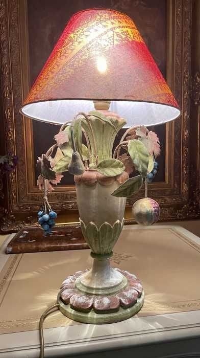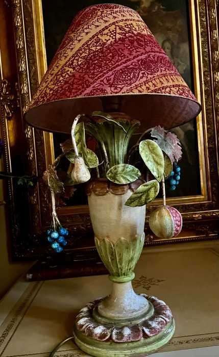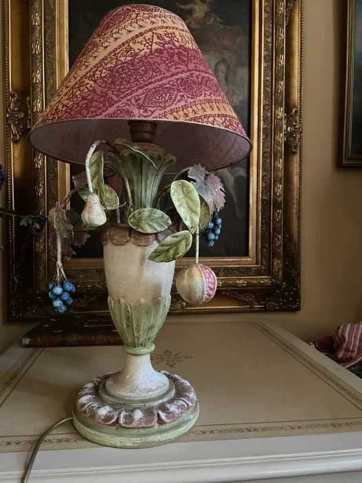 Superba lampa de masa, stil Hollywood Regency, structura din lemn pictat manual, ornamente inedite din metal si lemn- fructe- ramuri- frunze, cromatica deosebita-culori pastelate-, stare foarte buna, impact vizual, achizitie Italia. Dimensiuni h 60 cm. Variante transport.